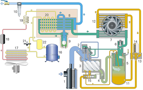空氣從空氣過濾器(1)吸入,經(jīng)卸荷閥(2)進入壓縮機主機(3)后被壓縮,壓縮后的油氣混合物通過單向閥(4)進入儲氣罐/油氣分離器(5),分離后的壓縮空氣經(jīng)最小壓